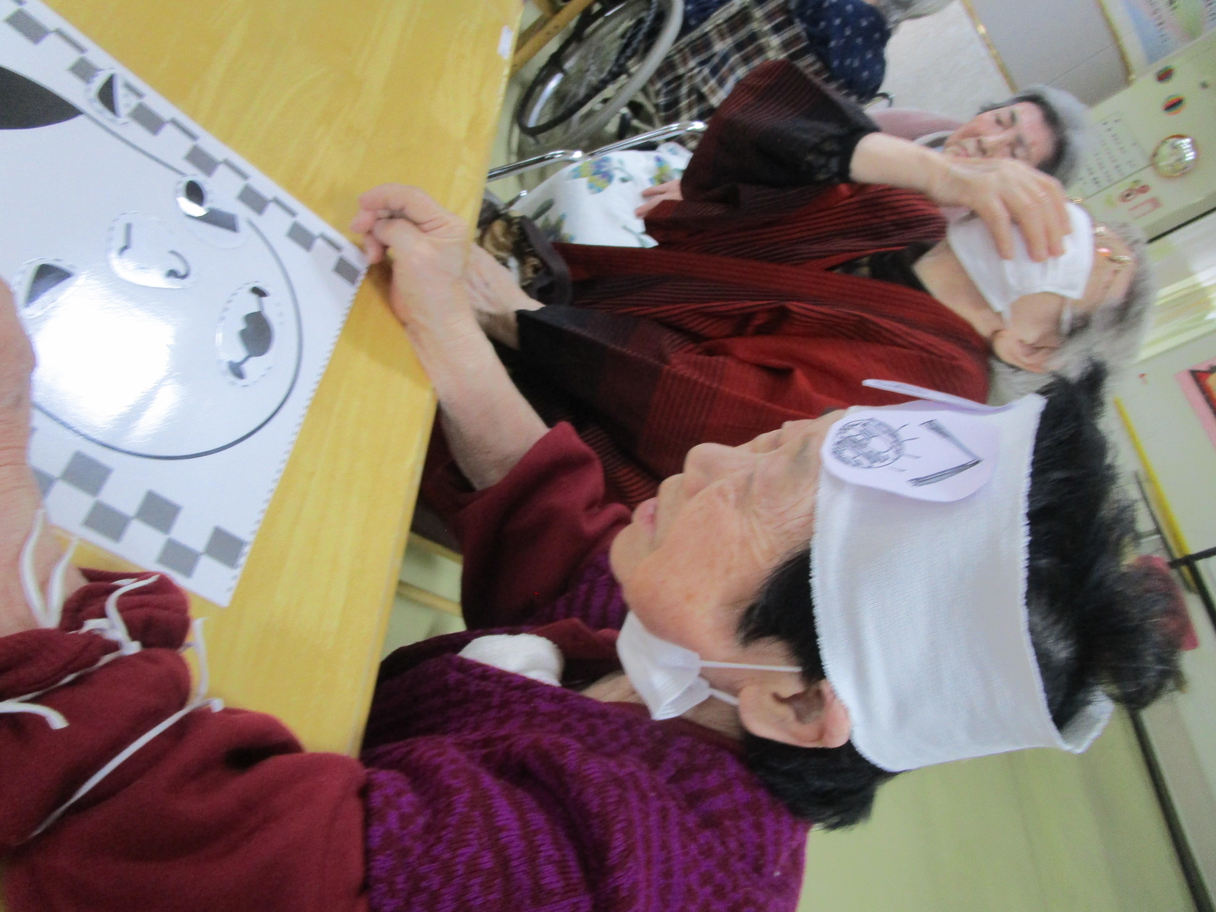今回も新年から楽しんいただくようにと福笑いを準備。また、おやつとして